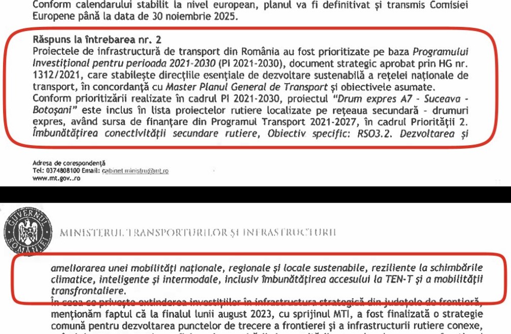 „Conform prioritizării realizate în cadrul Planului Investițional 2021-2030, proiectul Drum Expres A7 (Suceava) – Botoșani este inclus în lista proiectelor rutiere localizate pe rețeaua secundară – drumuri expres, având ca sursă de finanțare Programul de Transport 2021–2027, în cadrul Priorității 2: Îmbunătățirea conectivității secundare rutiere, Obiectiv specific RSO3.2: Dezvoltarea și ameliorarea unei mobilități naționale, regionale și locale sustenabile, reziliente la schimbările climatice, inteligente și intermodale, inclusiv îmbunătățirea accesului TEN-T și a mobilității transfrontaliere”, se arată în răspunsul la interpelare.