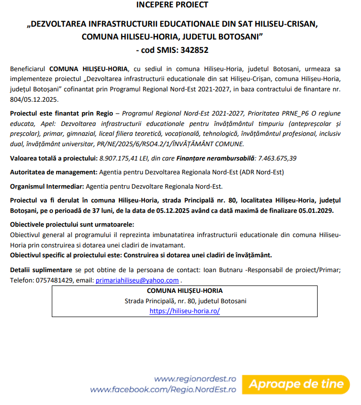 ANUNT: „DEZVOLTAREA INFRASTRUCTURII EDUCATIONALE DIN SAT HILISEU-CRISAN, COMUNA HILISEU-HORIA, JUDETUL BOTOSANI”