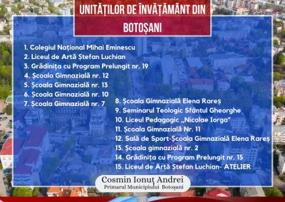 Această alocare financiară strategică reflectă angajamentul ferm față de dezvoltarea orașului și satisfacerea nevoilor esențiale ale comunității. Educația rămâne unul dintre pilonii centrali astfel, bugetul aprobat include fonduri semnificative pentru modernizarea școlilor și îmbunătățirea calității educației oferite tinerilor botoșăneni.