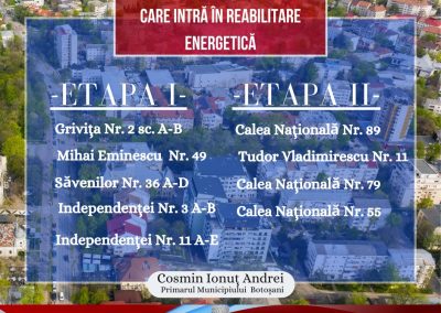 În ceea ce privește infrastructura și dezvoltarea urbanistică, primarul municipiului Botoșani Cosmin Andrei a declarat că este ferm hotărât să continue proiectele începute și să demareze altele noi. Finalizarea lucrărilor pe cele 20 de străzi incluse în Cvartalul I și II, precum și deschiderea altor șantiere pe străzi din diferite zone ale municipiului, sunt priorități cheie pentru îmbunătățirea infrastructurii noastre urbane. De asemenea, acesta a declarat că 9 clădiri rezidențiale vor fi reabilitate energetic pentru a oferi locuitorilor municipiului Botoșani condiții optime de confort și trai. Prin aceste investiții strategice, se propune transformarea Botoșaniul într-un loc modern, deschis și primitor pentru toți locuitorii săi.