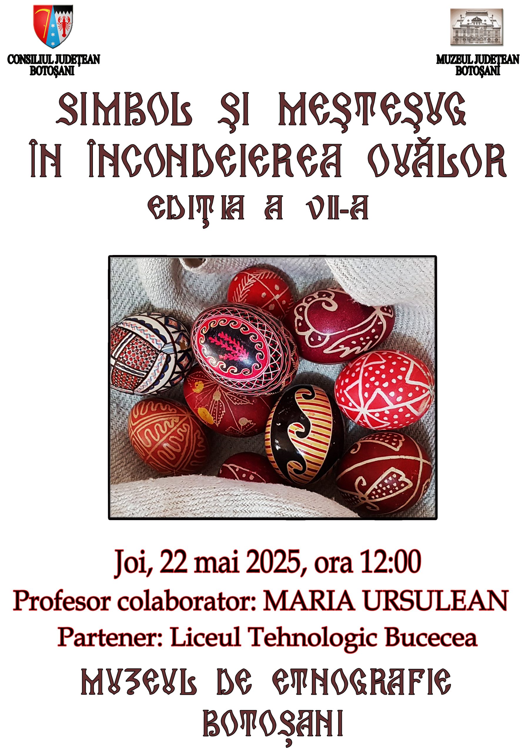 Cultura Atelierele de creație „Simbol și meșteșug în încondeierea ouălor”Muzeul Județean Botoșani, Secția de Artă Plastică – Etnografie – Științele Naturii, în... 21 mai 2025