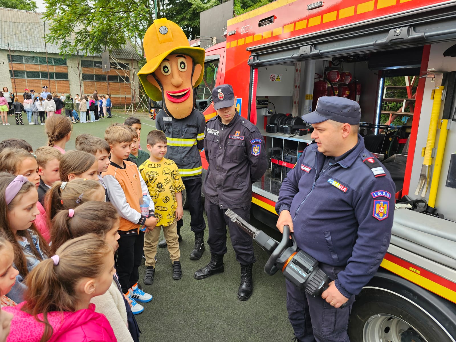 Copiii au aflat și în ce situații pompierii intervin cu autospecialele de stingere și cum se folosește fiecare accesoriu. Cei mai curajoși au testat presiunea furtunelor ca și când ar fi stins un incendiu.