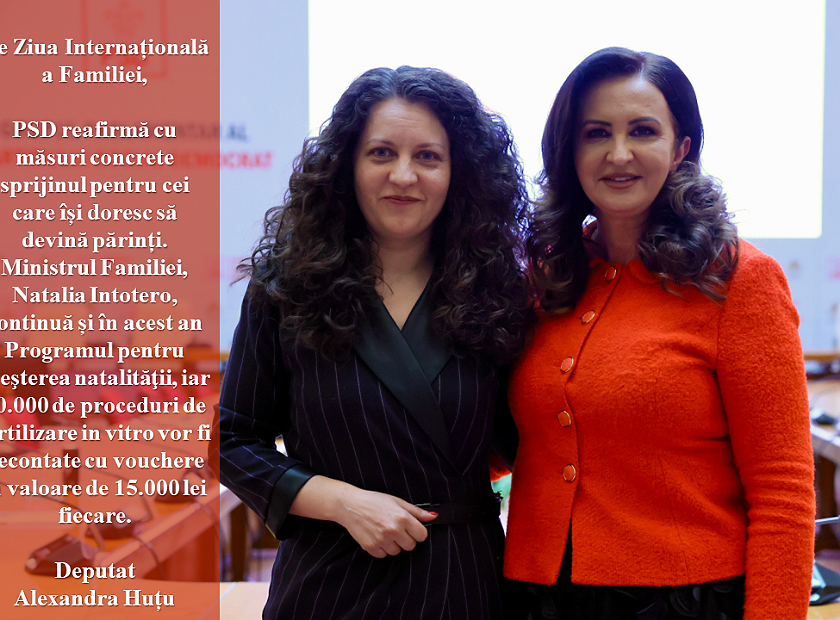 De Ziua Internațională a Familiei, deputatul social-democrat Alexandra Huțu, a anunțat că Ministerul Familiei, Tineretului și Egalității de Șanse desfășoară și în acest an „Programul social de interes național de susținere a cuplurilor și a persoanelor singure, pentru creșterea natalității”. Prin intermediul Programului sunt sprijinite 10.000 de cupluri și femei singure care nu pot avea copii din cauza unor probleme medicale, care vor primi vouchere în valoare de 15.000 de lei pentru decontarea procedurilor necesare obținerii unei sarcini.
