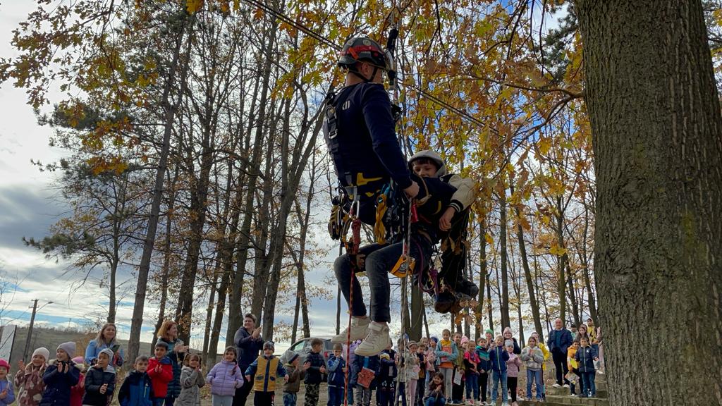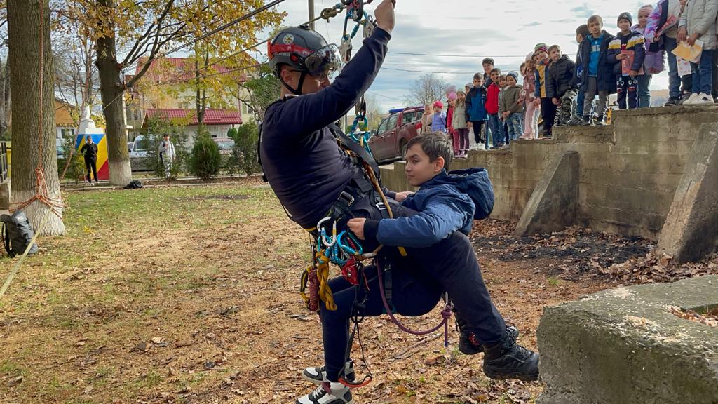 Alpiniștii ISU Botoșani au executat două exerciții demonstrative, simulând salvarea unor persoane de la înălțime sau izolate în mijlocul unui râu, iar cei mai curajoși dintre elevi au jucat rolul victimelor.