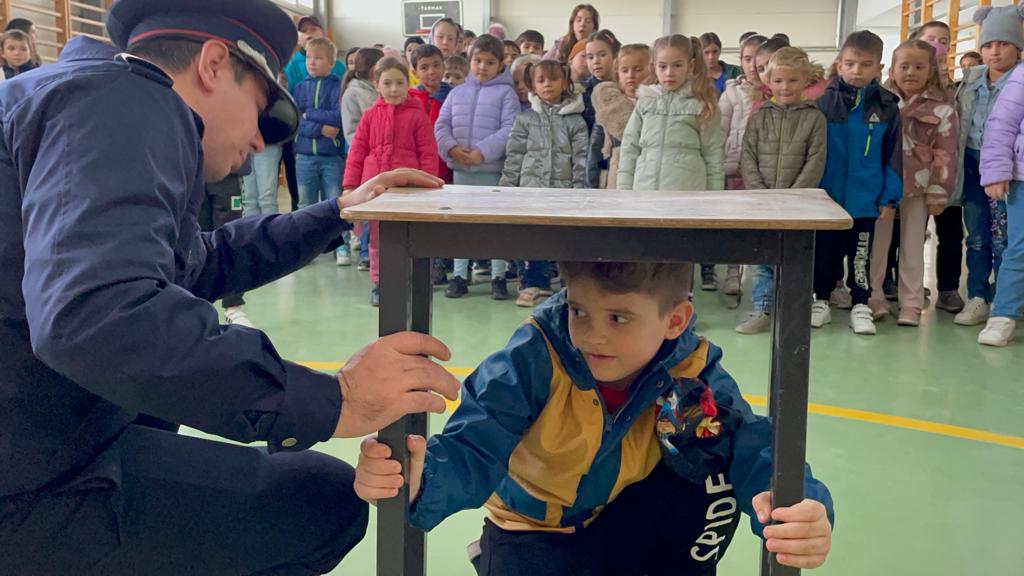 – adăpostiți-vă sub pupitre și stați departe de ferestre, de pereții exteriori sau de obiectele care v-ar putea răni;