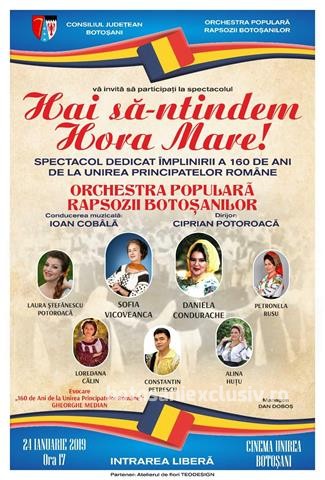 De Ziua Unirii, pe 24 ianuarie, Consiliul Judeţean Botoşani şi Orchestra Populară „Rapsozii Botoşanilor” vor marca 160 de ani de la Unirea Principatelor Române printr-un spectacol de muzică populară şi patriotică. Spectacolul „Hai să-ntindem Hora Mare!”, va avea loc la Cinematograful Unirea începând cu ora 17.00.