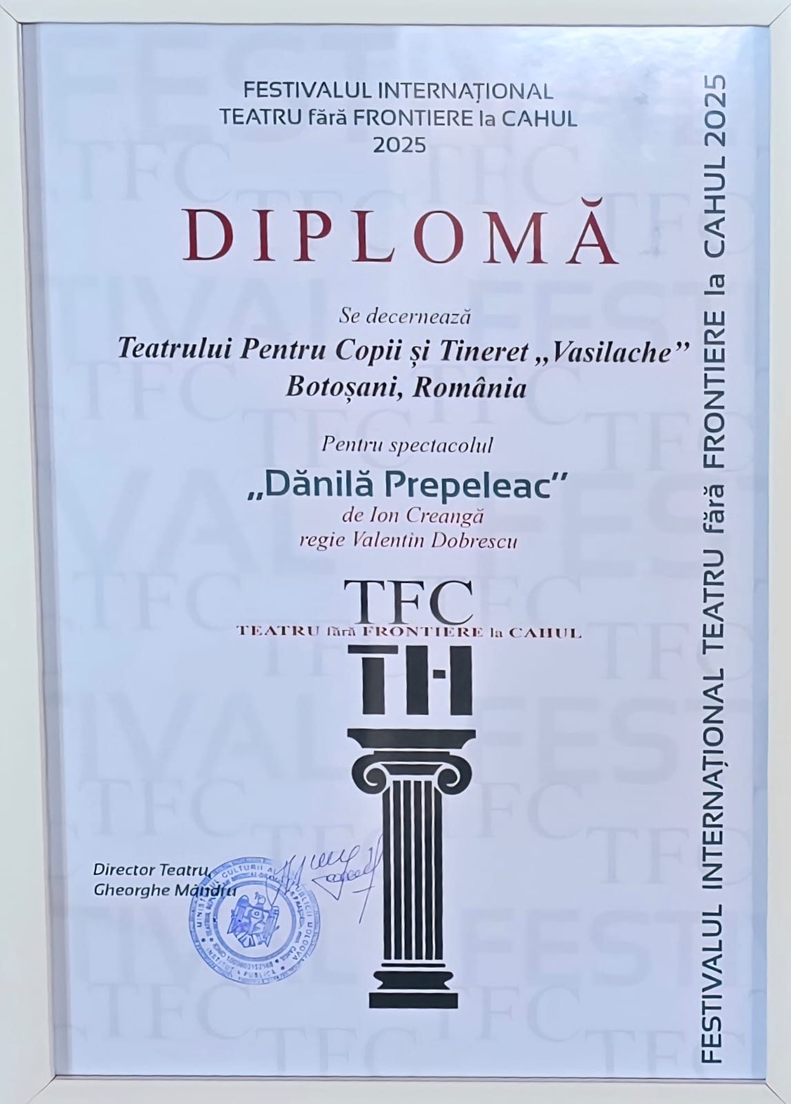 Teatrul pentru Copii și Tineret „Vasilache” a participat, în perioada 15-17 octombrie 2025, la cea de-a doua ediţie a Festivalului Internaţional TFC 2025 – Teatrul fără Frontiere la Cahul, organizat de Teatrul Republican Muzical Dramatic „B.P. Hasdeu” din Cahul!