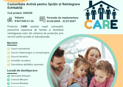 „CARE – Comunitate Activă pentru Sprijin și Reintegrare Echitabilă” este finanțat de Uniunea Europeană prin Fondul Social European, Programul Incluziune şi Demnitate Socială 2021 – 2027, se desfășoară pe perioada 01.02.2025 – 31.07.2027 și are o valoare totală de 9.947.640,11 RON.
