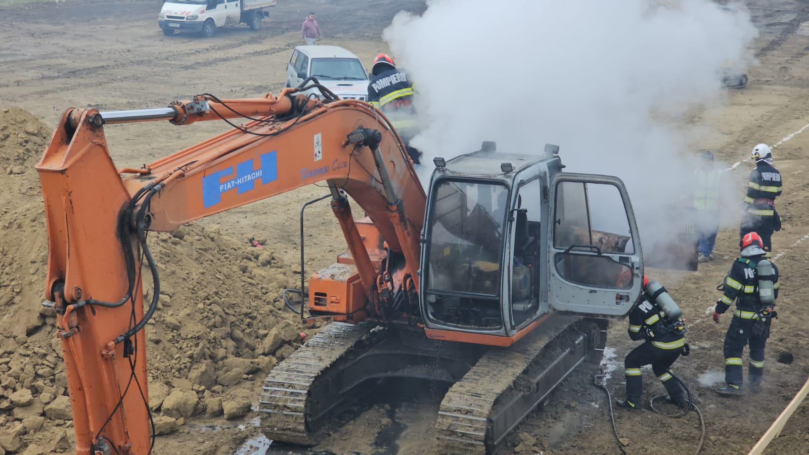 Soferul a observat că iese fum din zona compartimentului motor, a oprit utilajul, a coborât imediat și a sunat după ajutor la 112. S-a întâmplat în urmă cu puțin timp.