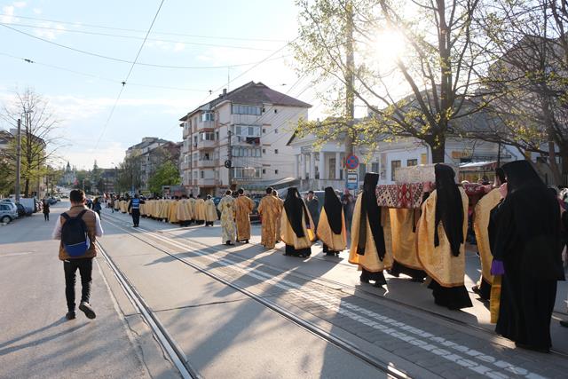 După slujba Vecerniei unită cu Litia, oficiată de către IPS Părinte Mitropolit Teofan, PS Părinte Episcop Vicar Nichifor Botoșăneanul și PS Părinte Arhiereu-vicar Gherontie Hunedoreanul la Biserica „Sfântul Mare Mucenic Gheorghe” din oraș, mii de botoșăneni au participat la prima ediție a Procesiunii Învierii.
